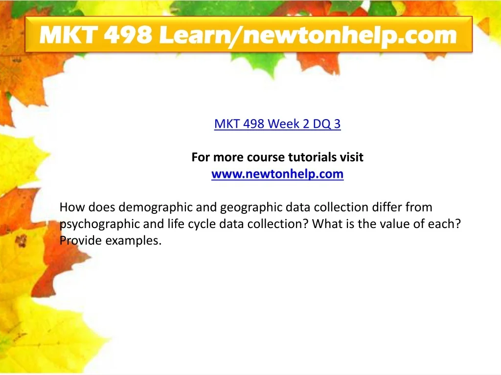 MKT 498 Learn/newtonhelp.com MKT 498 Week 2 DQ 3 For more course tutorials visit www.newtonhelp.com How does demographic and geographic data collection differ from psychographic and life cycle data collection? What is the value of each? Provide examples.