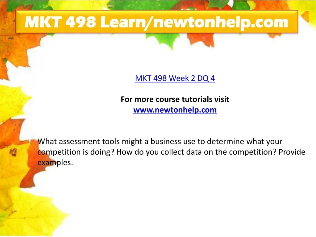 MKT 498 Learn/newtonhelp.com MKT 498 Week 2 DQ 4 For more course tutorials visit www.newtonhelp.com What assessment tools might a business use to determine what your competition is doing? How do you collect data on the competition? Provide examples.