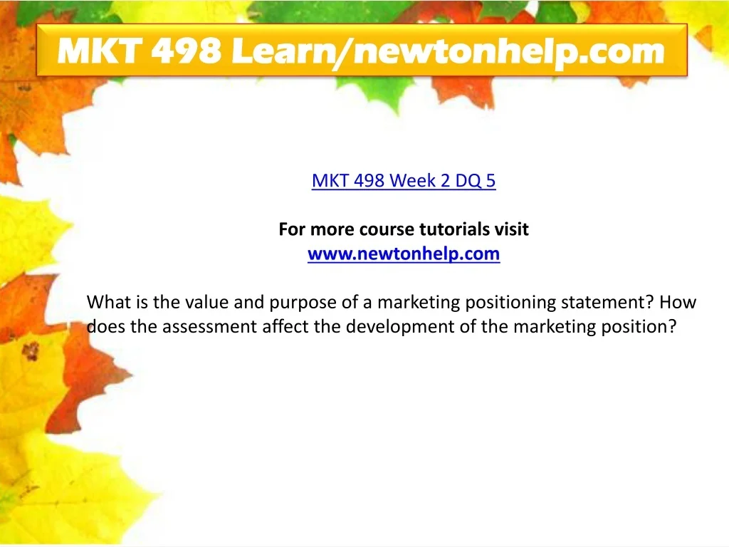 MKT 498 Learn/newtonhelp.com MKT 498 Week 2 DQ 5 For more course tutorials visit www.newtonhelp.com What is the value and purpose of a marketing positioning statement? How does the assessment affect the development of the marketing position?