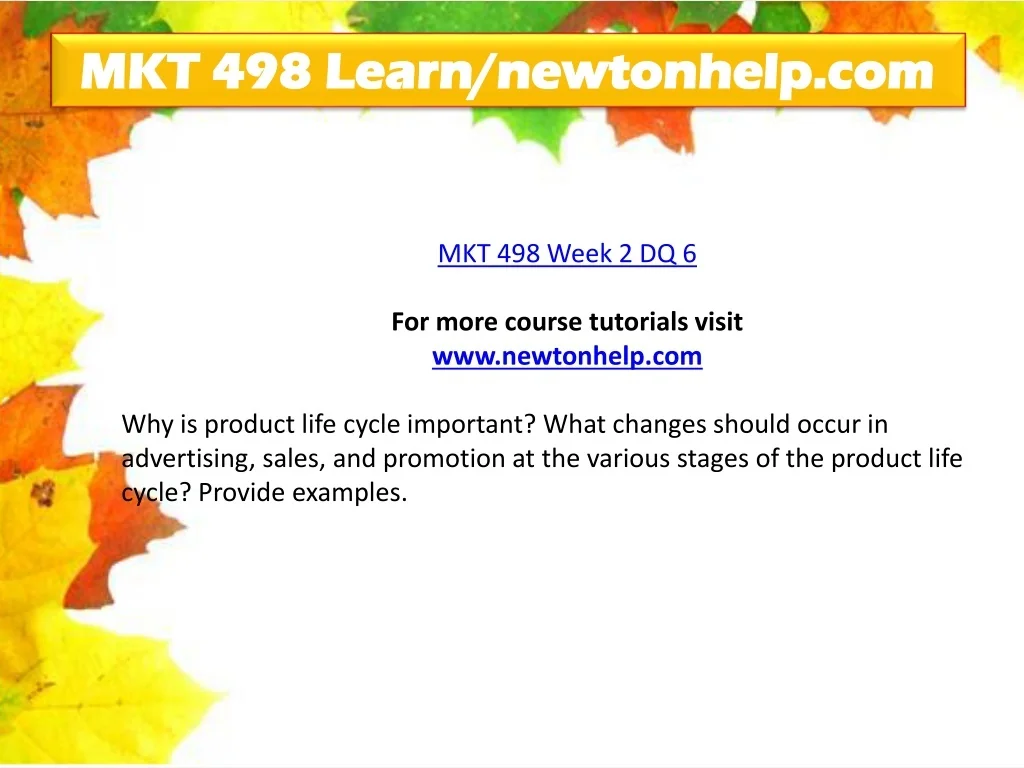 MKT 498 Learn/newtonhelp.com MKT 498 Week 2 DQ 6 For more course tutorials visit www.newtonhelp.com Why is product life cycle important? What changes should occur in advertising, sales, and promotion at the various stages of the product life cycle? Provide examples.