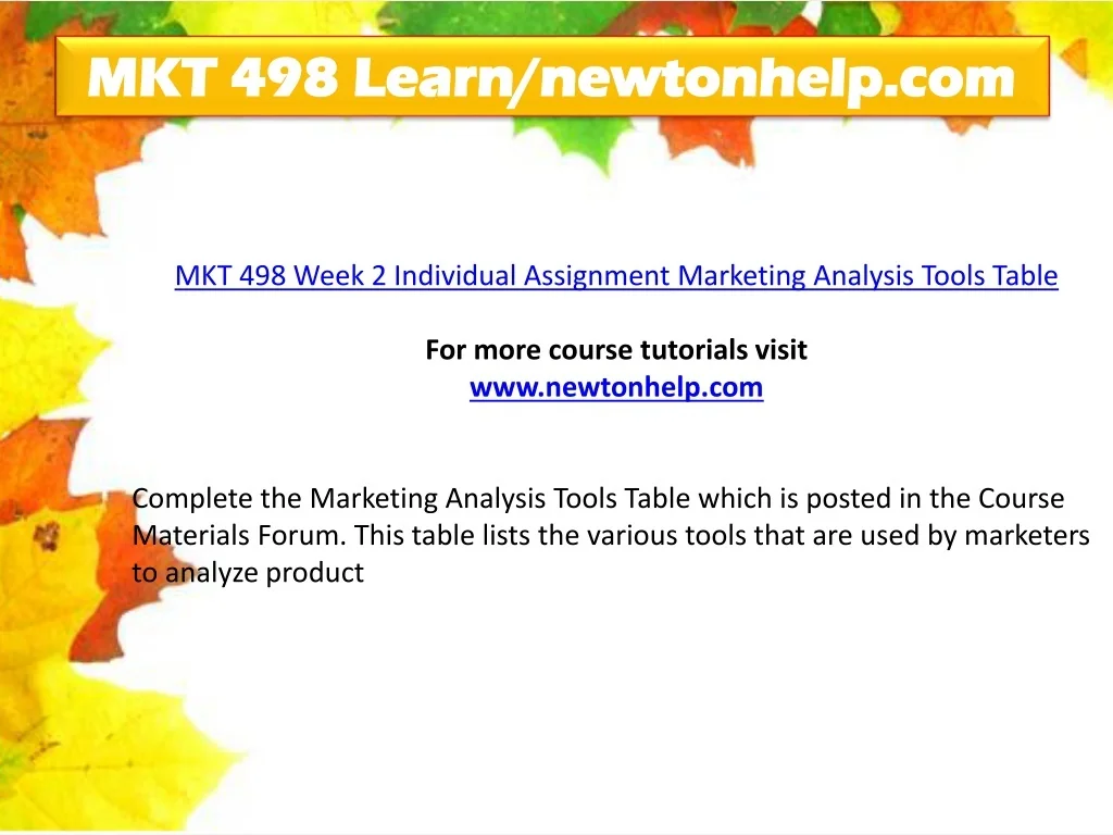 MKT 498 Learn/newtonhelp.com MKT 498 Week 2 Individual Assignment Marketing Analysis Tools Table For more course tutorials visit www.newtonhelp.com Complete the Marketing Analysis Tools Table which is posted in the Course Materials Forum. This table lists the various tools that are used by marketers to analyze product