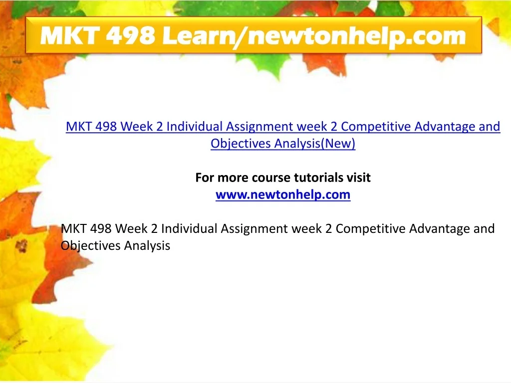 MKT 498 Learn/newtonhelp.com MKT 498 Week 2 Individual Assignment week 2 Competitive Advantage and Objectives Analysis(New) For more course tutorials visit www.newtonhelp.com MKT 498 Week 2 Individual Assignment week 2 Competitive Advantage and Objectives Analysis