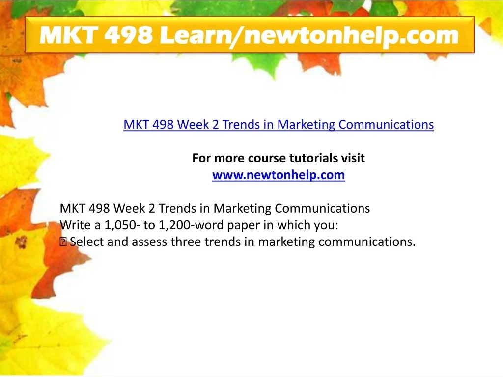 MKT 498 Learn/newtonhelp.com MKT 498 Week 2 Trends in Marketing Communications For more course tutorials visit www.newtonhelp.com MKT 498 Week 2 Trends in Marketing Communications Write a 1,050- to 1,200-word paper in which you: Select and assess three trends in marketing communications.