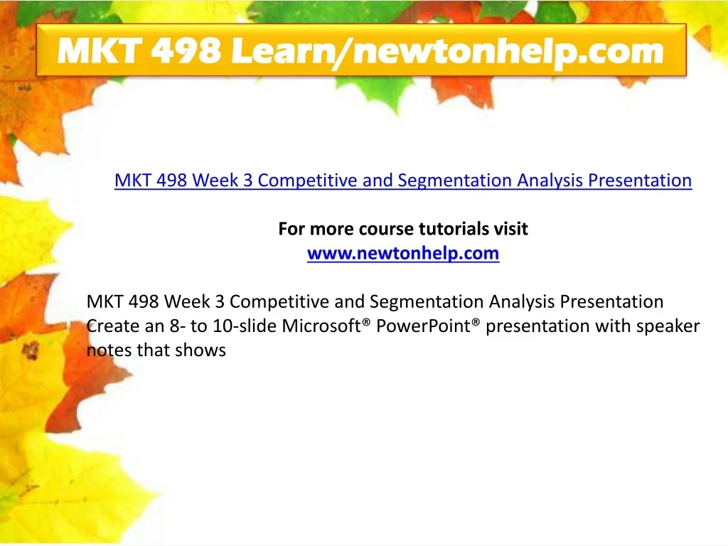 MKT 498 Learn/newtonhelp.com MKT 498 Week 3 Competitive and Segmentation Analysis Presentation For more course tutorials visit www.newtonhelp.com MKT 498 Week 3 Competitive and Segmentation Analysis Presentation Create an 8- to 10-slide Microsoft® PowerPoint® presentation with speaker notes that shows