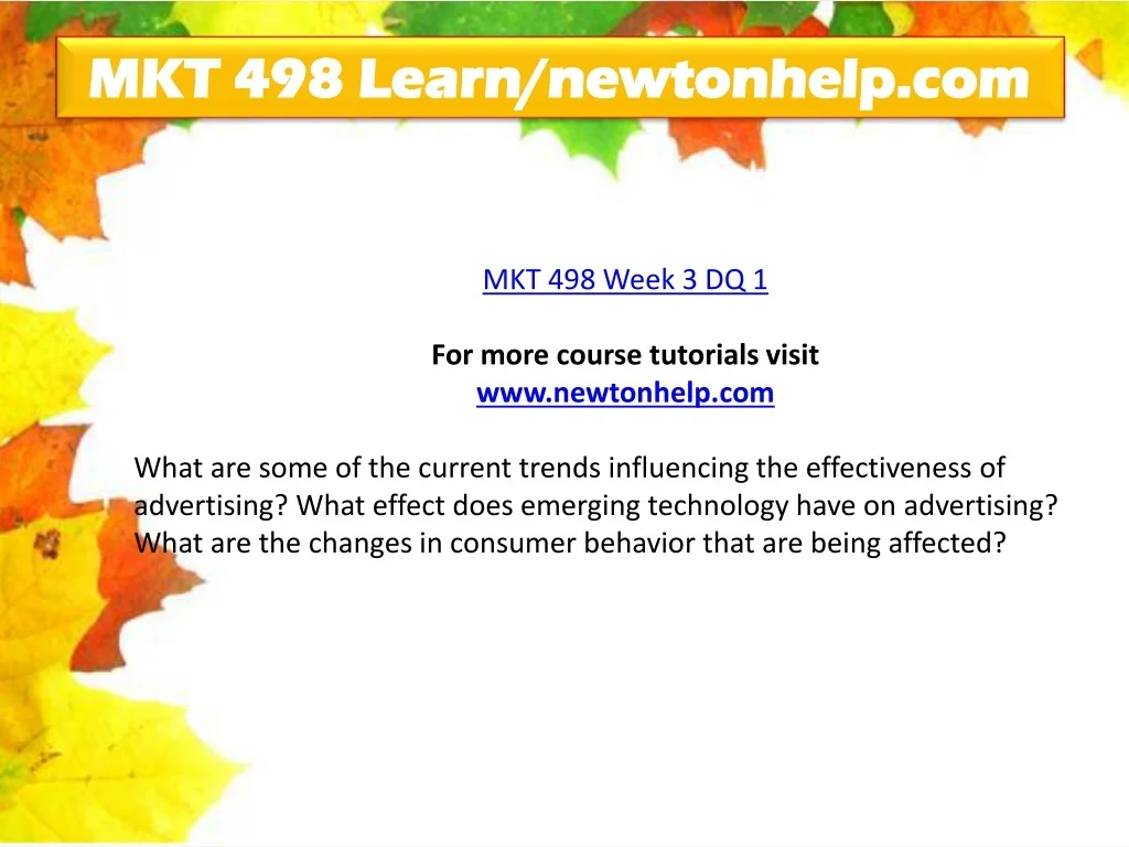 MKT 498 Learn/newtonhelp.com MKT 498 Week 3 DQ 1 For more course tutorials visit www.newtonhelp.com What are some of the current trends influencing the effectiveness of advertising? What effect does emerging technology have on advertising? What are the changes in consumer behavior that are being affected?