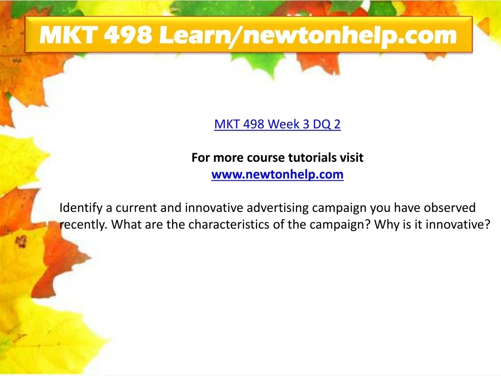 MKT 498 Learn/newtonhelp.com MKT 498 Week 3 DQ 2 For more course tutorials visit www.newtonhelp.com Identify a current and innovative advertising campaign you have observed recently. What are the characteristics of the campaign? Why is it innovative?