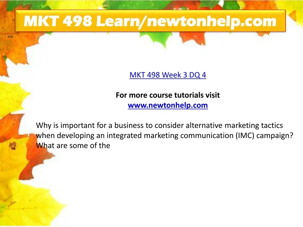 MKT 498 Learn/newtonhelp.com MKT 498 Week 3 DQ 4 For more course tutorials visit www.newtonhelp.com Why is important for a business to consider alternative marketing tactics when developing an integrated marketing communication (IMC) campaign? What are some of the