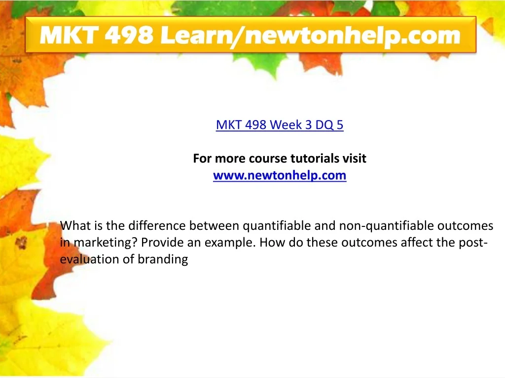 MKT 498 Learn/newtonhelp.com MKT 498 Week 3 DQ 5 For more course tutorials visit www.newtonhelp.com What is the difference between quantifiable and non-quantifiable outcomes in marketing? Provide an example. How do these outcomes affect the post-evaluation of branding