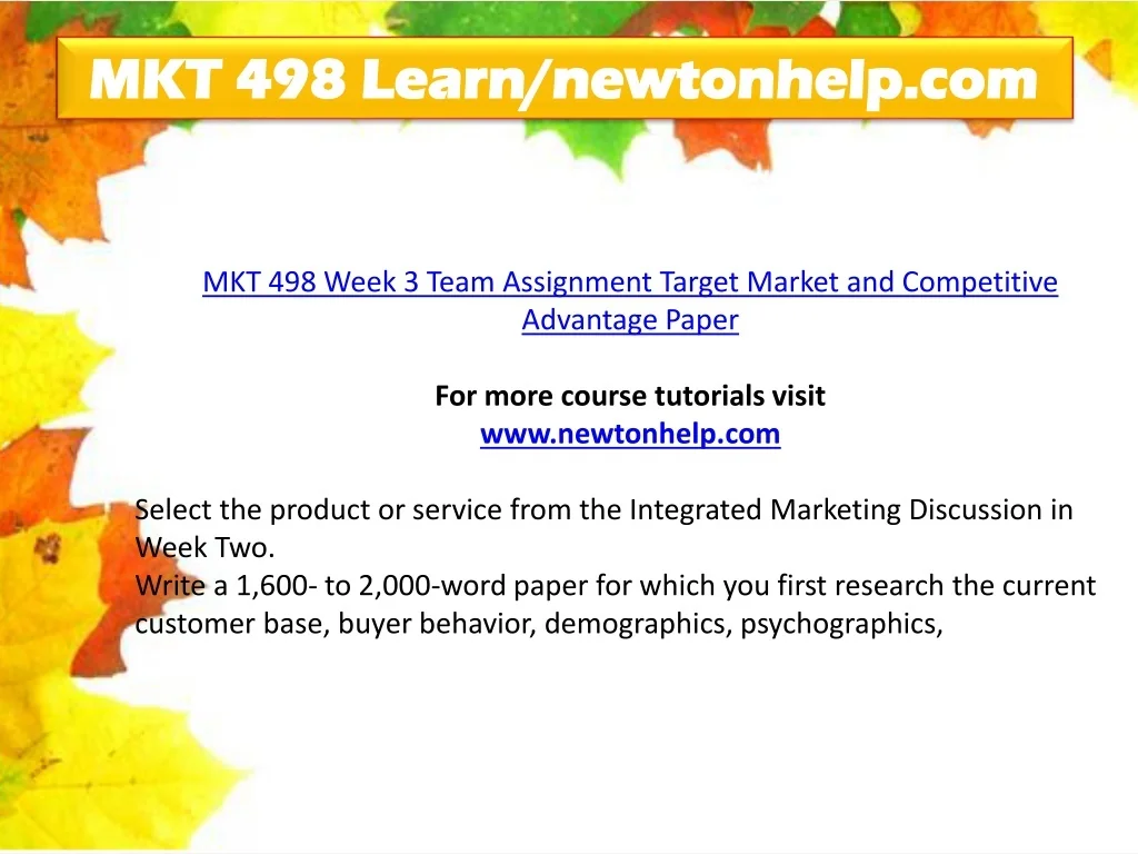 MKT 498 Learn/newtonhelp.com MKT 498 Week 4 Team Assignment Marketing Position Statement Presentation For more course tutorials visit www.newtonhelp.com Utilize the research from your Learning Team’s Target Market and Competitive Advantage Analysis in Week Three. Create a 12-slide Microsoft® PowerPoint® presentation