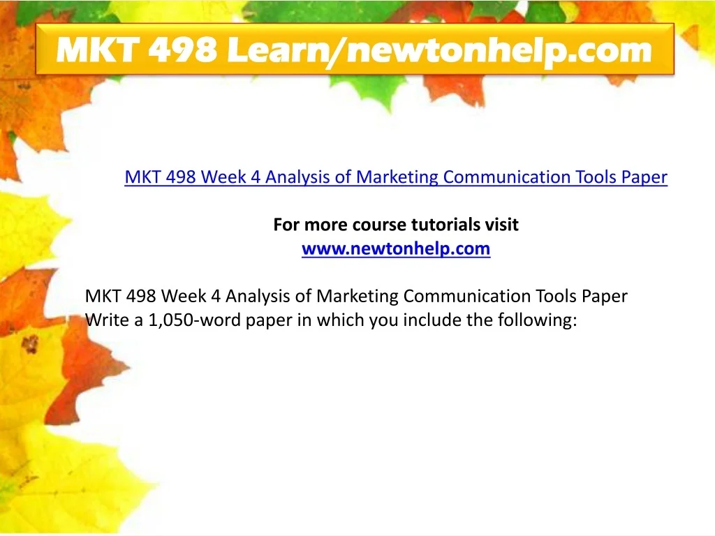 MKT 498 Learn/newtonhelp.com MKT 498 Week 4 Analysis of Marketing Communication Tools Paper For more course tutorials visit www.newtonhelp.com MKT 498 Week 4 Analysis of Marketing Communication Tools Paper Write a 1,050-word paper in which you include the following: