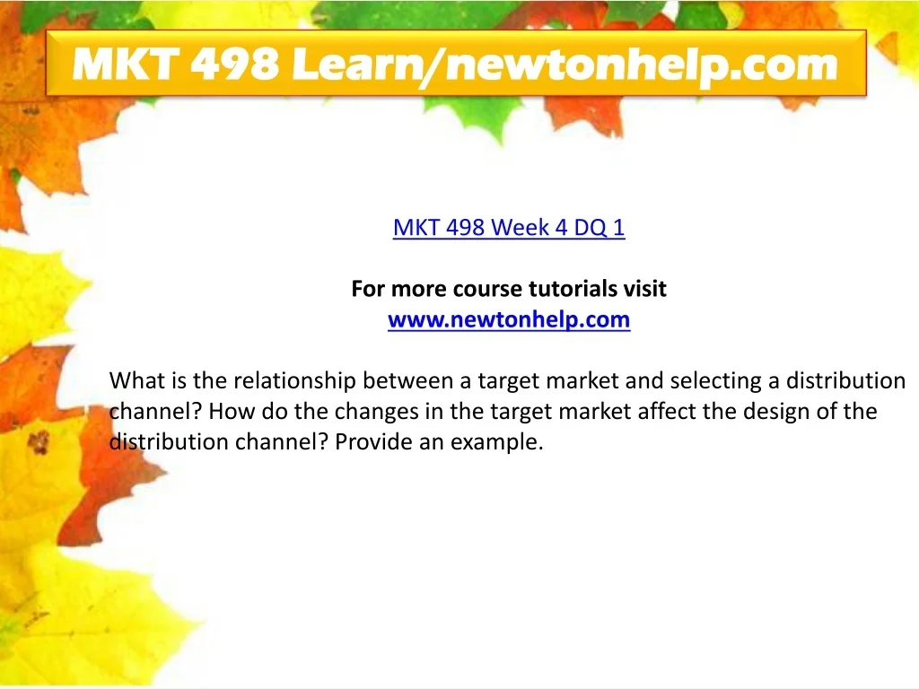 MKT 498 Learn/newtonhelp.com MKT 498 Week 4 DQ 1 For more course tutorials visit www.newtonhelp.com What is the relationship between a target market and selecting a distribution channel? How do the changes in the target market affect the design of the distribution channel? Provide an example.