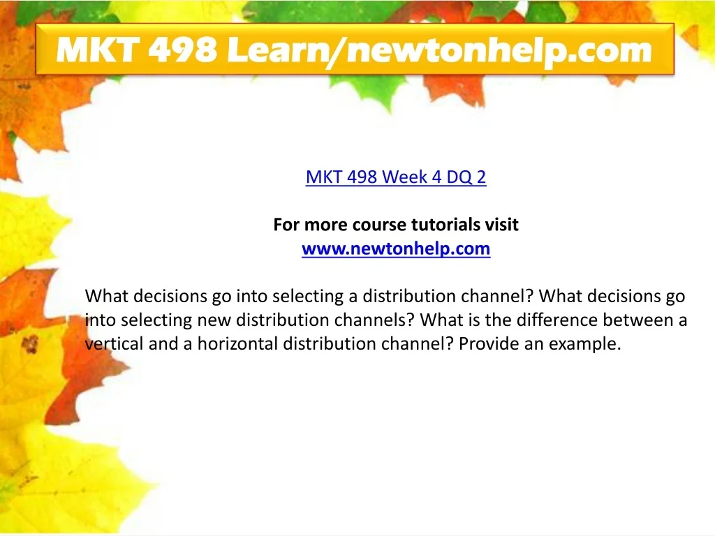 MKT 498 Learn/newtonhelp.com MKT 498 Week 4 DQ 2 For more course tutorials visit www.newtonhelp.com What decisions go into selecting a distribution channel? What decisions go into selecting new distribution channels? What is the difference between a vertical and a horizontal distribution channel? Provide an example.
