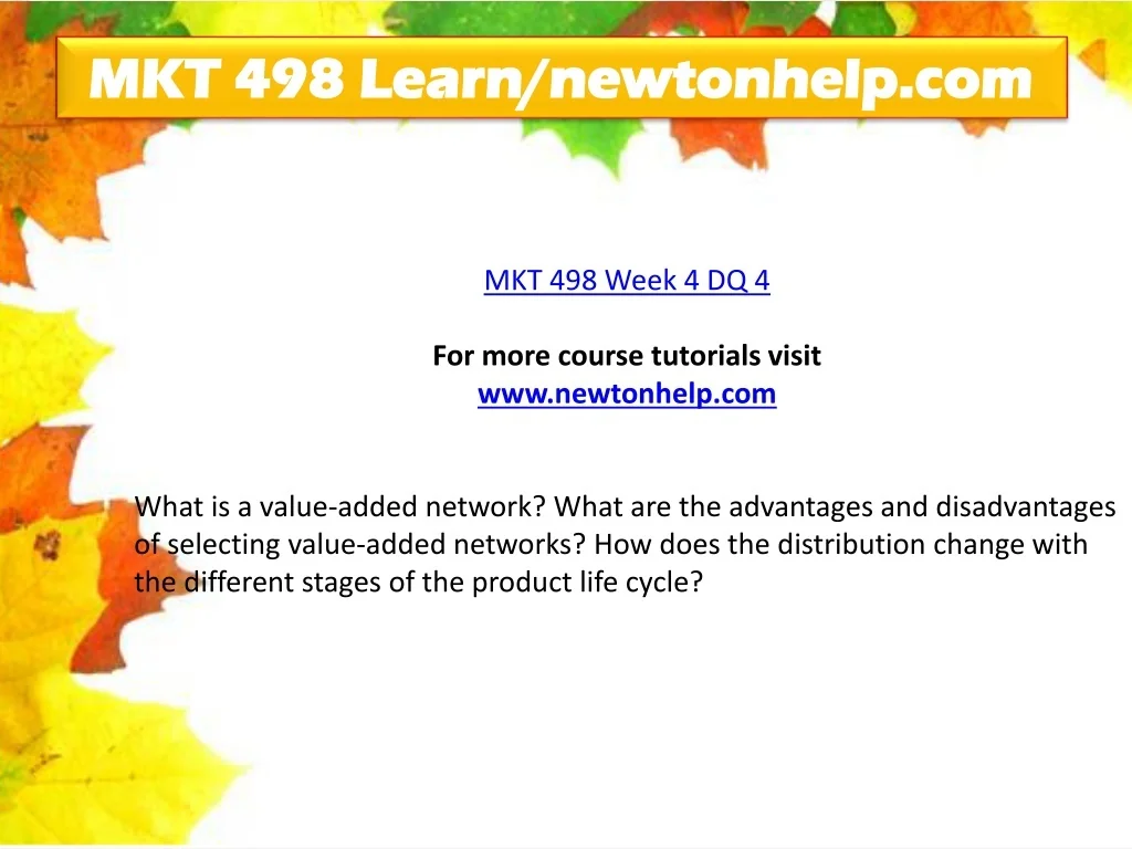 MKT 498 Learn/newtonhelp.com MKT 498 Week 4 DQ 4 For more course tutorials visit www.newtonhelp.com What is a value-added network? What are the advantages and disadvantages of selecting value-added networks? How does the distribution change with the different stages of the product life cycle?