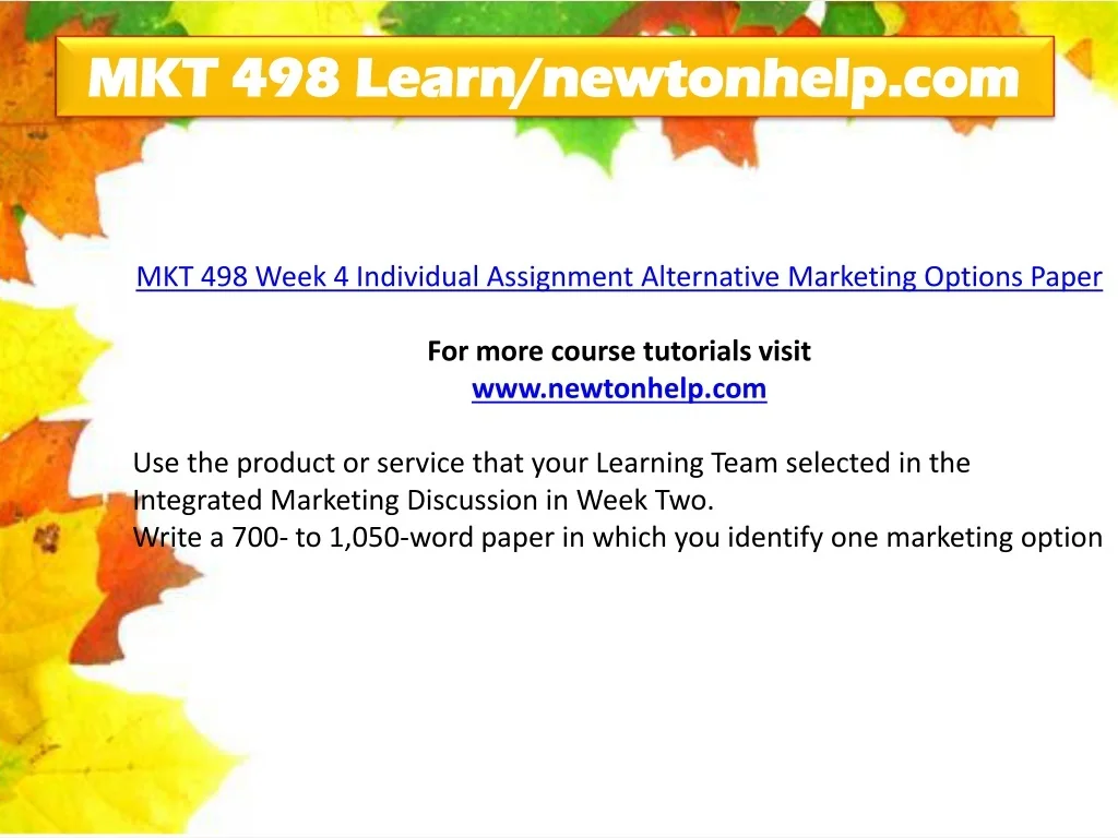 MKT 498 Learn/newtonhelp.com MKT 498 Week 4 Individual Assignment Alternative Marketing Options Paper For more course tutorials visit www.newtonhelp.com Use the product or service that your Learning Team selected in the Integrated Marketing Discussion in Week Two. Write a 700- to 1,050-word paper in which you identify one marketing option