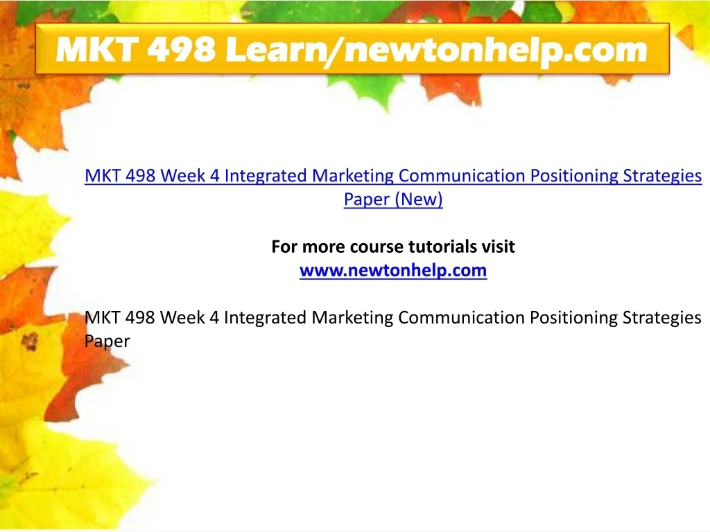 MKT 498 Learn/newtonhelp.com MKT 498 Week 4 Integrated Marketing Communication Positioning Strategies Paper (New) For more course tutorials visit www.newtonhelp.com MKT 498 Week 4 Integrated Marketing Communication Positioning Strategies Paper