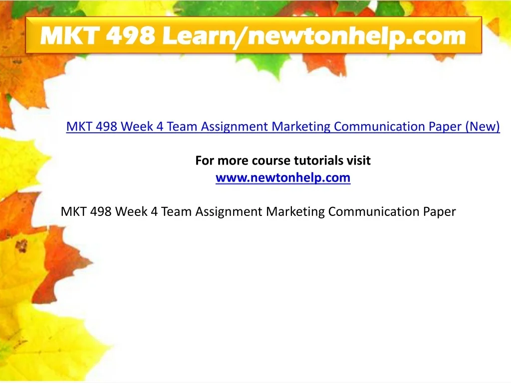MKT 498 Learn/newtonhelp.com MKT 498 Week 4 Team Assignment Marketing Communication Paper (New) For more course tutorials visit www.newtonhelp.com MKT 498 Week 4 Team Assignment Marketing Communication Paper