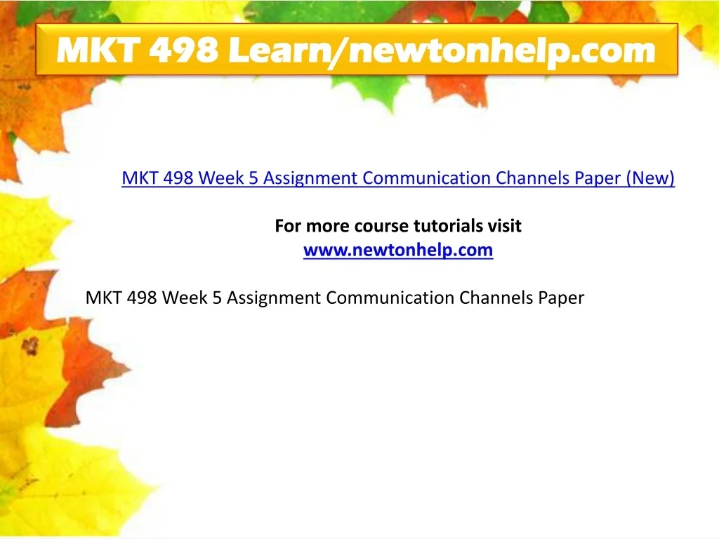 MKT 498 Learn/newtonhelp.com MKT 498 Week 5 Assignment Communication Channels Paper (New) For more course tutorials visit www.newtonhelp.com MKT 498 Week 5 Assignment Communication Channels Paper