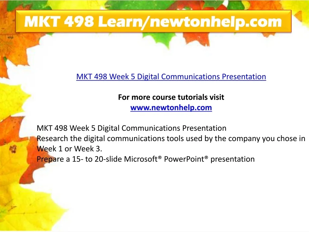 MKT 498 Learn/newtonhelp.com MKT 498 Week 5 Digital Communications Presentation For more course tutorials visit www.newtonhelp.com MKT 498 Week 5 Digital Communications Presentation Research the digital communications tools used by the company you chose in Week 1 or Week 3. Prepare a 15- to 20-slide Microsoft® PowerPoint® presentation