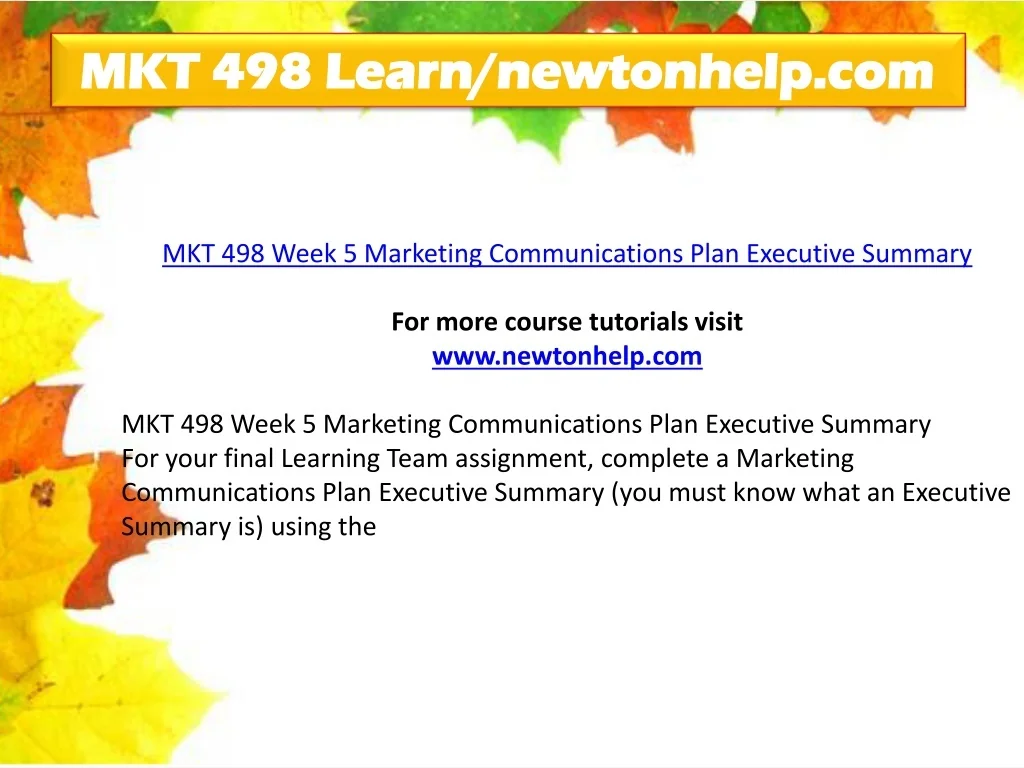MKT 498 Learn/newtonhelp.com MKT 498 Week 5 Marketing Communications Plan Executive Summary For more course tutorials visit www.newtonhelp.com MKT 498 Week 5 Marketing Communications Plan Executive Summary For your final Learning Team assignment, complete a Marketing Communications Plan Executive Summary (you must know what an Executive Summary is) using the