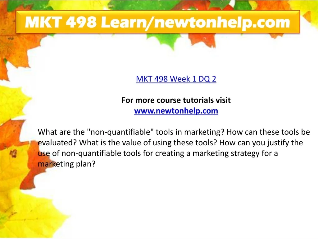 MKT 498 Learn/newtonhelp.com MKT 498 Week 1 DQ 2 For more course tutorials visit www.newtonhelp.com What are the "non-quantifiable" tools in marketing? How can these tools be evaluated? What is the value of using these tools? How can you justify the use of non-quantifiable tools for creating a marketing strategy for a marketing plan?