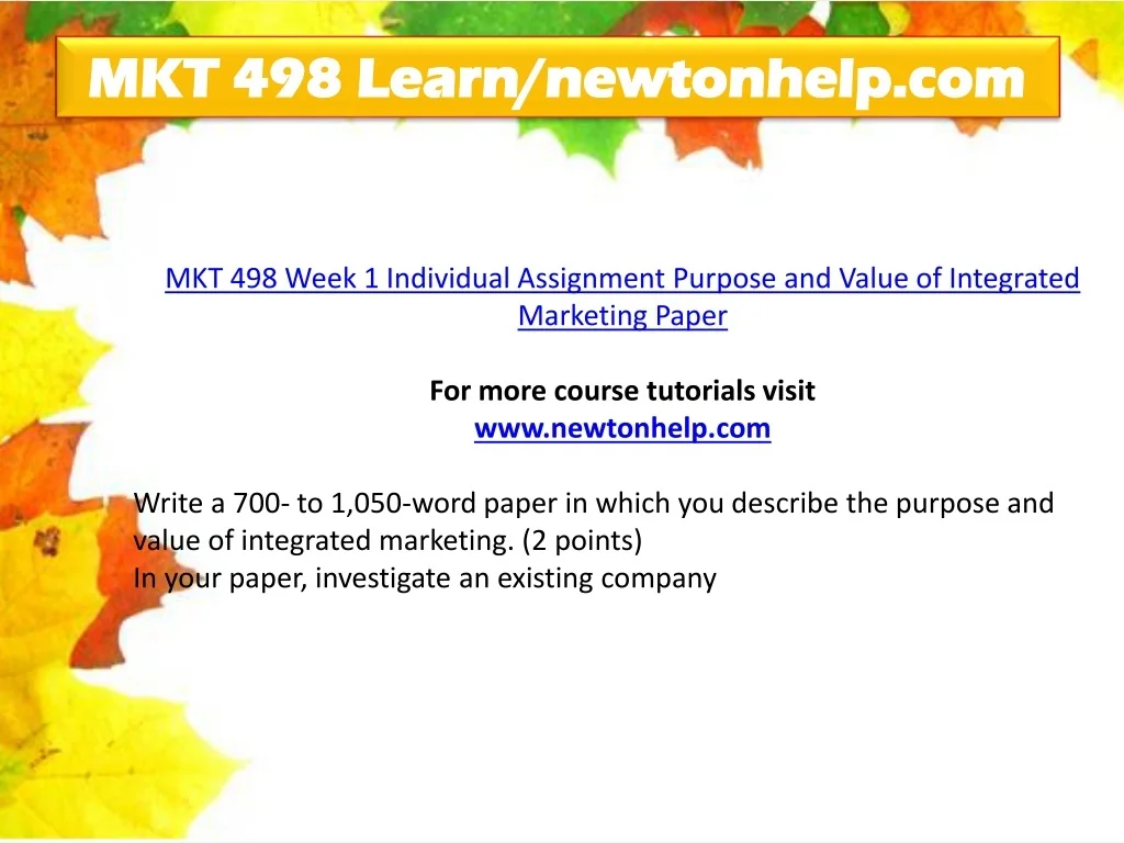 MKT 498 Learn/newtonhelp.com MKT 498 Week 1 Individual Assignment Purpose and Value of Integrated Marketing Paper (New) For more course tutorials visit www.newtonhelp.com MKT 498 Week 1 Individual Assignment Purpose and Value