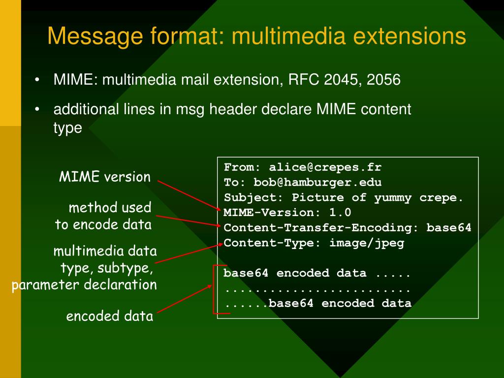 MIME: multimedia mail extension, RFC 2045, 2056 additional lines in msg header declare MIME content type From: alice@crepes.fr To: bob@hamburger.edu Subject: Picture of yummy crepe. MIME-Version: 1.0 Content-Transfer-Encoding: base64 Content-Type: image/jpeg base64 encoded data ..... ......................... ......base64 encoded data Message format: multimedia extensions MIME version method used to encode data multimedia data type, subtype, parameter declaration encoded data
