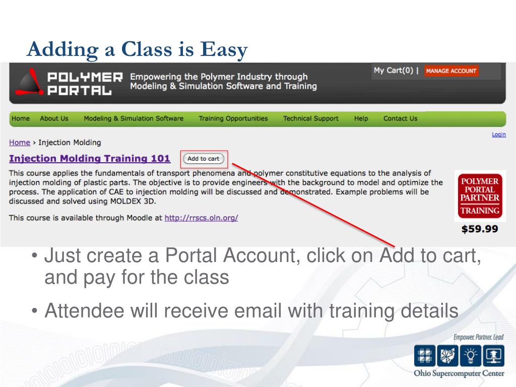 Adding a Class is Easy • Just create a Portal Account, click on Add to cart, and pay for the class • Attendee will receive email with training details