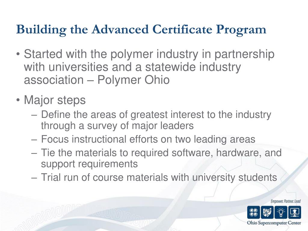 Building the Advanced Certificate Program • Started with the polymer industry in partnership with universities and a statewide industry association – Polymer Ohio • Major steps • Define the areas of greatest interest to the industry through a survey of major leaders • Focus instructional efforts on two leading areas • Tie the materials to required software, hardware, and support requirements • Trial run of course materials with university students