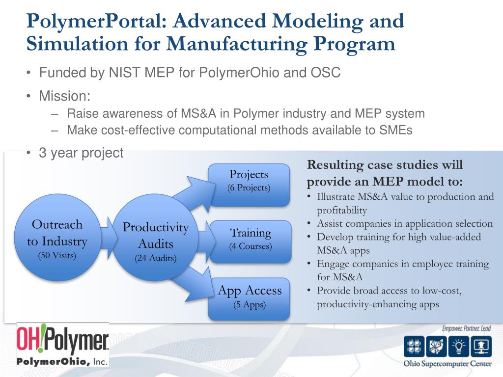 PolymerPortal: Advanced Modeling and Simulation for Manufacturing Program • Funded by NIST MEP for PolymerOhio and OSC • Mission: • Raise awareness of MS&A in Polymer industry and MEP system • Make cost-effective computational methods available to SMEs • 3 year project • Resulting case studies will provide an MEP model to: • Illustrate MS&A value to production and profitability • Assist companies in application selection • Develop training for high value-added MS&A apps • Engage companies in employee training for MS&A • Provide broad access to low-cost, productivity-enhancing apps Projects (6 Projects) Outreach to Industry (50 Visits) Productivity Audits (24 Audits) Training (4 Courses) App Access (5 Apps)