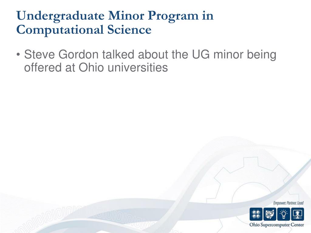 Undergraduate Minor Program in Computational Science • Steve Gordon talked about the UG minor being offered at Ohio universities
