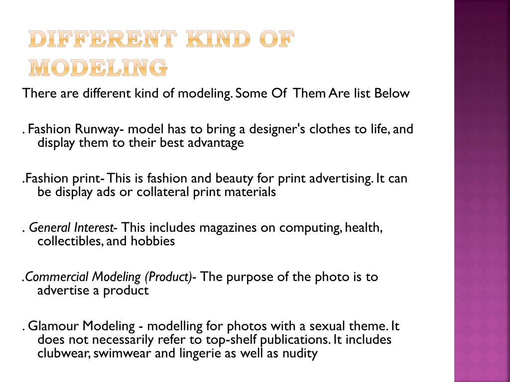 DIFFERENT KIND OF MODELING There are different kind of modeling. Some Of Them Are list Below . Fashion Runway- model has to bring a designer's clothes to life, and display them to their best advantage .Fashion print- This is fashion and beauty for print advertising. It can be display ads or collateral print materials .General Interest- This includes magazines on computing, health, collectibles, and hobbies .Commercial Modeling (Product)- The purpose of the photo is to advertise a product . Glamour Modeling - modelling for photos with a sexual theme. It does not necessarily refer to top-shelf publications. It includes clubwear, swimwear and lingerie as well as nudity