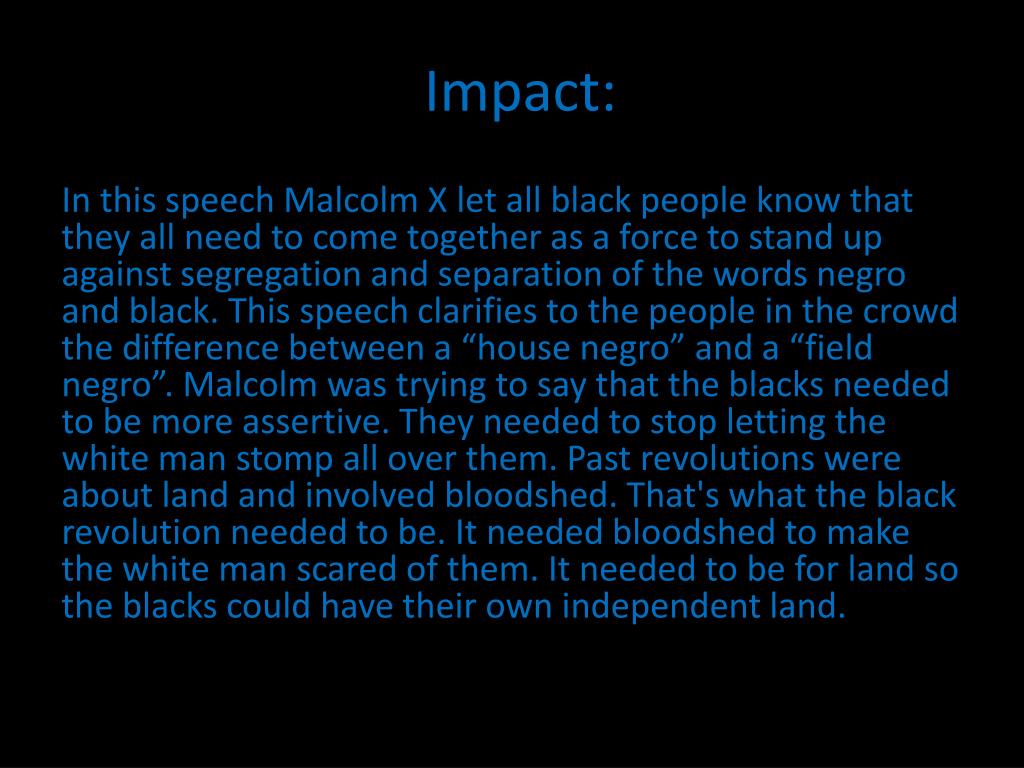 Impact: In this speech Malcolm X let all black people know that they all need to come together as a force to stand up against segregation and separation of the words negro and black. This speech clarifies to the people in the crowd the difference between a “house negro” and a “field negro”. Malcolm was trying to say that the blacks needed to be more assertive. They needed to stop letting the white man stomp all over them. Past revolutions were about land and involved bloodshed. That's what the black revolution needed to be. It needed bloodshed to make the white man scared of them. It needed to be for land so the blacks could have their own independent land.