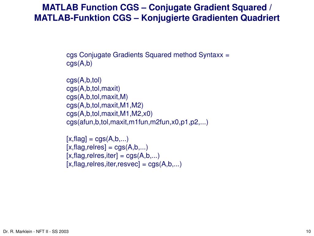 Iterative Methods for the Solution of Discrete Integral Equations / Iterative Methode zur Lösung von diskreten Integralgleichungen CG Method – Conjugate Gradient (CG) Method M. R. Hestenes & E. Stiefel, 1952 BiCG Method – Biconjugate Gradient (BiCG) Method C. Lanczos, 1952 D. A. H. Jacobs, 1981 C. F. Smith et al., 1990 R. Barret et al., 1994 CGS Method – Conjugate Gradient Squared (CGS) Method (MATLAB Function) P. Sonneveld, 1989 GMRES Method – Generalized Minimal – Residual (GMRES) Method Y. Saad & M. H. Schultz, 1986 R. Barret et al., 1994 Y. Saad, 1996 QMR Method – Quasi–Minimal–Residual (QMR) Method R. Freund & N. Nachtigal, 1990 N. Nachtigal, 1991 R. Barret et al., 1994 Y. Saad, 1996 Dr. R. Marklein - NFT II - SS 2003