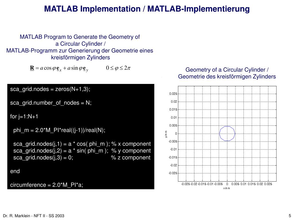 MATLAB Implementation / MATLAB-Implementierung MATLAB Program to Generate the Geometry of a Circular Cylinder / MATLAB-Programm zur Generierung der Geometrie eines kreisförmigen Zylinders Geometry of a Circular Cylinder / Geometrie des kreisförmigen Zylinders sca_grid.nodes = zeros(N+1,3); sca_grid.number_of_nodes = N; for j=1:N+1 phi_m = 2.0*M_PI*real((j-1))/real(N); sca_grid.nodes(j,1) = a * cos( phi_m ); % x component sca_grid.nodes(j,2) = a * sin( phi_m ); % y component sca_grid.nodes(j,3) = 0; % z component end circumference = 2.0*M_PI*a; Dr. R. Marklein - NFT II - SS 2003