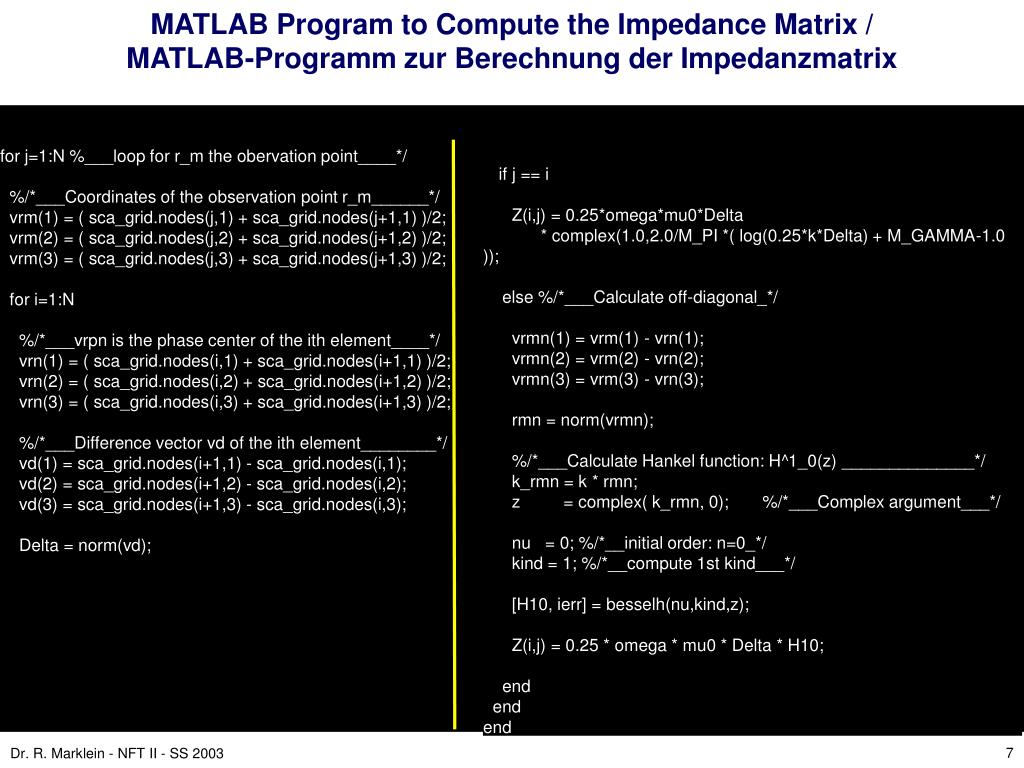 MATLAB Program to Compute the Impedance Matrix /MATLAB-Programm zur Berechnung der Impedanzmatrix for j=1:N %___loop for r_m the obervation point____*/ %/*___Coordinates of the observation point r_m______*/ vrm(1) = ( sca_grid.nodes(j,1) + sca_grid.nodes(j+1,1) )/2; vrm(2) = ( sca_grid.nodes(j,2) + sca_grid.nodes(j+1,2) )/2; vrm(3) = ( sca_grid.nodes(j,3) + sca_grid.nodes(j+1,3) )/2; for i=1:N %/*___vrpn is the phase center of the ith element____*/ vrn(1) = ( sca_grid.nodes(i,1) + sca_grid.nodes(i+1,1) )/2; vrn(2) = ( sca_grid.nodes(i,2) + sca_grid.nodes(i+1,2) )/2; vrn(3) = ( sca_grid.nodes(i,3) + sca_grid.nodes(i+1,3) )/2; %/*___Difference vector vd of the ith element________*/ vd(1) = sca_grid.nodes(i+1,1) - sca_grid.nodes(i,1); vd(2) = sca_grid.nodes(i+1,2) - sca_grid.nodes(i,2); vd(3) = sca_grid.nodes(i+1,3) - sca_grid.nodes(i,3); Delta = norm(vd); if j == i Z(i,j) = 0.25*omega*mu0*Delta * complex(1.0,2.0/M_PI *( log(0.25*k*Delta) + M_GAMMA-1.0 )); else %/*___Calculate off-diagonal_*/ vrmn(1) = vrm(1) - vrn(1); vrmn(2) = vrm(2) - vrn(2); vrmn(3) = vrm(3) - vrn(3); rmn = norm(vrmn); %/*___Calculate Hankel function: H^1_0(z) ______________*/ k_rmn = k * rmn; z = complex( k_rmn, 0); %/*___Complex argument___*/ nu = 0; %/*__initial order: n=0_*/ kind = 1; %/*__compute 1st kind___*/ [H10, ierr] = besselh(nu,kind,z); Z(i,j) = 0.25 * omega * mu0 * Delta * H10; end end end Dr. R. Marklein - NFT II - SS 2003