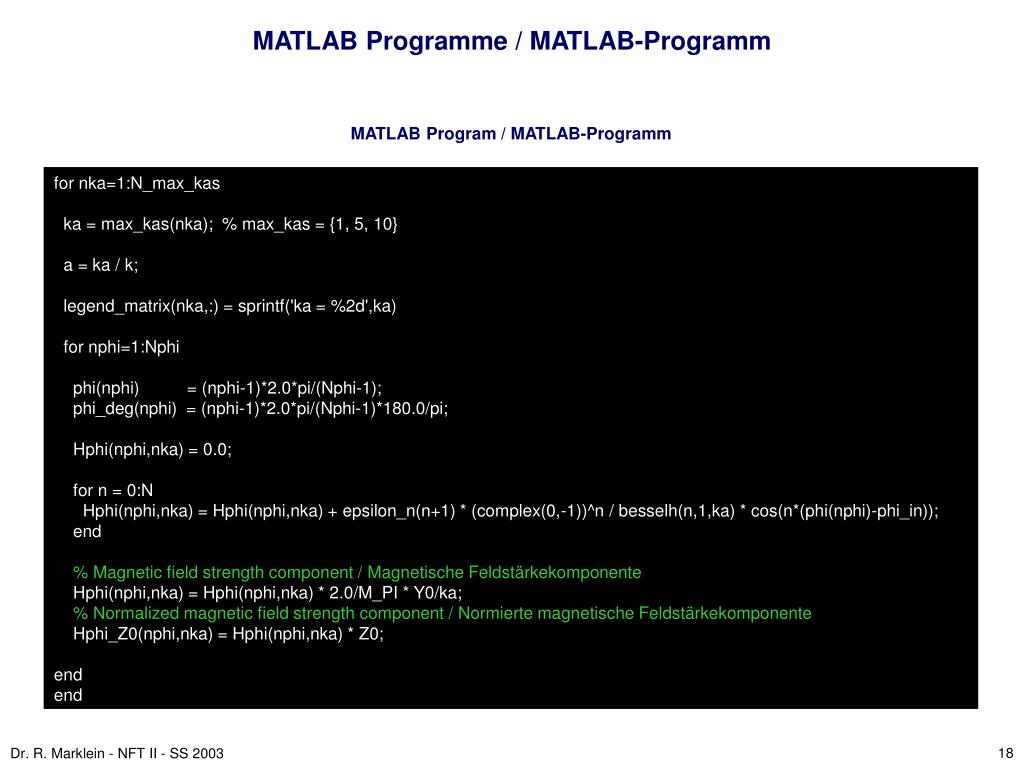 MATLAB Programme / MATLAB-Programm MATLAB Program / MATLAB-Programm for nka=1:N_max_kas ka = max_kas(nka); % max_kas = {1, 5, 10} a = ka / k; legend_matrix(nka,:) = sprintf('ka = %2d',ka) for nphi=1:Nphi phi(nphi) = (nphi-1)*2.0*pi/(Nphi-1); phi_deg(nphi) = (nphi-1)*2.0*pi/(Nphi-1)*180.0/pi; Hphi(nphi,nka) = 0.0; for n = 0:N Hphi(nphi,nka) = Hphi(nphi,nka) + epsilon_n(n+1) * (complex(0,-1))^n / besselh(n,1,ka) * cos(n*(phi(nphi)-phi_in)); end % Magnetic field strength component / Magnetische Feldstärkekomponente Hphi(nphi,nka) = Hphi(nphi,nka) * 2.0/M_PI * Y0/ka; % Normalized magnetic field strength component / Normierte magnetische Feldstärkekomponente Hphi_Z0(nphi,nka) = Hphi(nphi,nka) * Z0; end end Dr. R. Marklein - NFT II - SS 2003