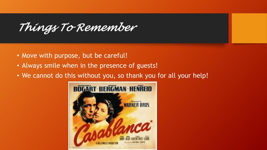 Things To Remember • Move with purpose, but be careful! • Always smile when in the presence of guests! • We cannot do this without you, so thank you for all your help!