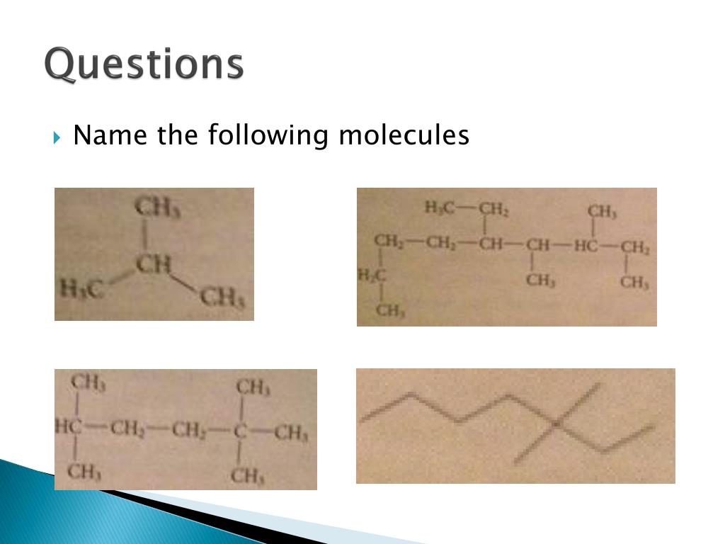 Questions • Draw the condensed formula for • 2-methylbutane • 2,2-dimethyl-3-propyloctane • Draw the line structural formula for • 3,3,4-triethylnonane • 3,3,4,4-tetramethyldecane