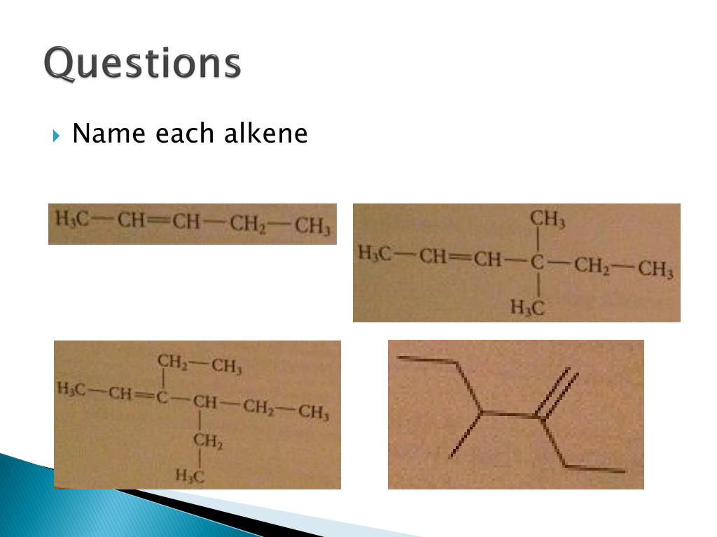 Questions • Draw the condensed structural formula for • 3-propylhept-2-ene • 4-ethyl-2,5-dimethyloct-3-ene • Draw a line structural formula for • 2-methylbut-1-ene • 4-ethyl-4,5-dimethylhex-1-ene