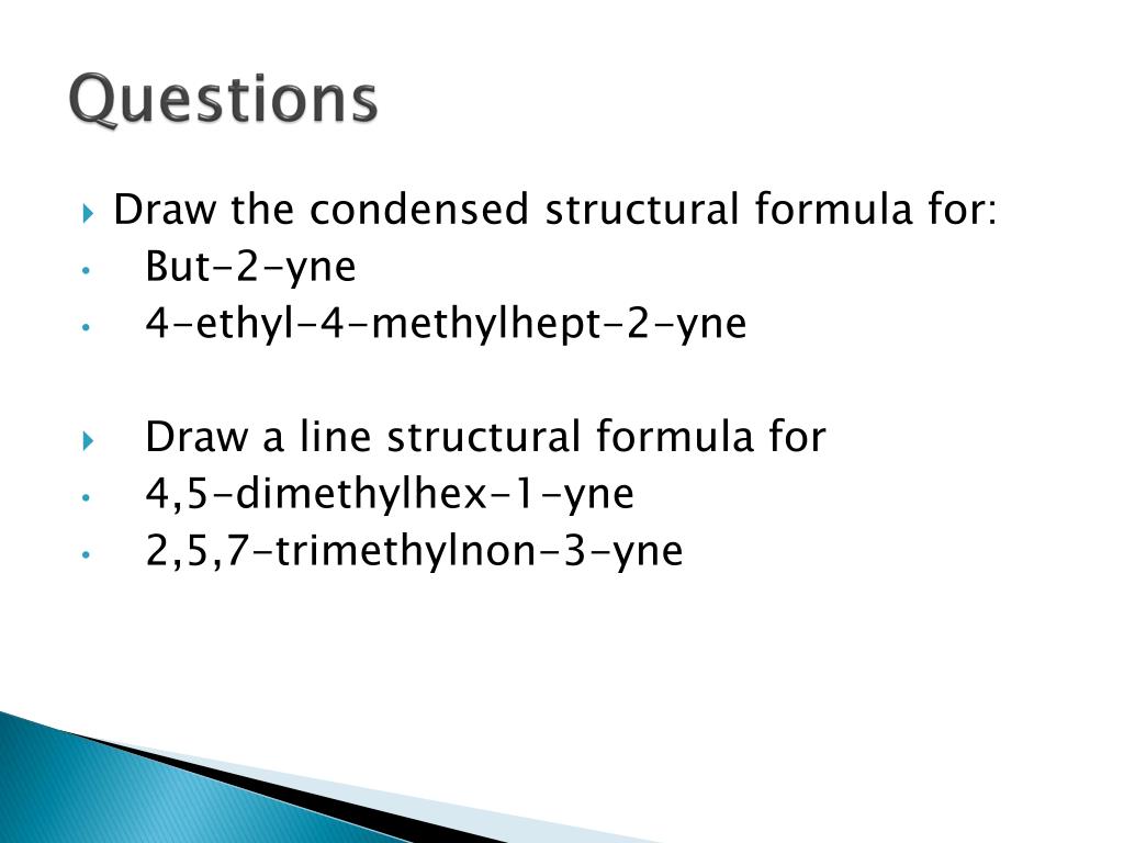 Questions • Draw the condensed structural formula for: • But-2-yne • 4-ethyl-4-methylhept-2-yne • Draw a line structural formula for • 4,5-dimethylhex-1-yne • 2,5,7-trimethylnon-3-yne