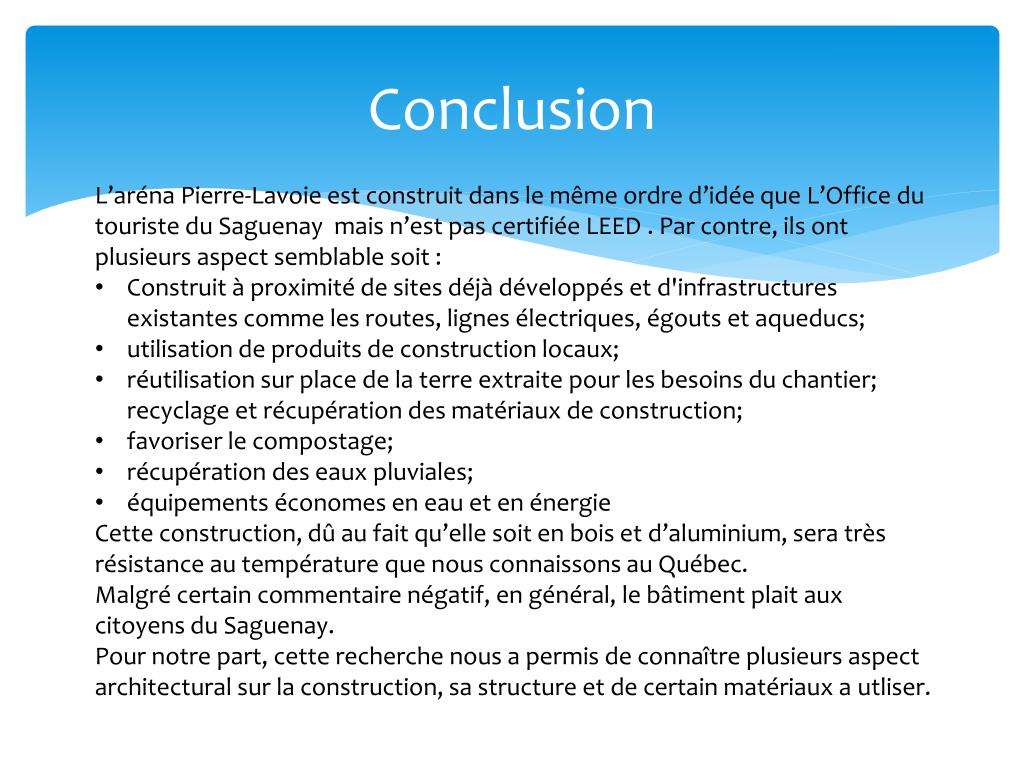 Conclusion • L’aréna Pierre-Lavoie est construit dans le même ordre d’idée que L’Office du touriste du Saguenay mais n’est pas certifiée LEED . Par contre, ils ont plusieurs aspect semblable soit : • Construit à proximité de sites déjà développés et d'infrastructures existantes comme les routes, lignes électriques, égouts et aqueducs; • utilisation de produits de construction locaux; • réutilisation sur place de la terre extraite pour les besoins du chantier;recyclage et récupération des matériaux de construction; • favoriser le compostage; • récupération des eaux pluviales; • équipements économes en eau et en énergie • Cette construction, dû au fait qu’elle soit en bois et d’aluminium, sera très résistance au température que nous connaissons au Québec. • Malgré certain commentaire négatif, en général, le bâtiment plait aux citoyens du Saguenay. • Pour notre part, cette recherche nous a permis de connaître plusieurs aspect architectural sur la construction, sa structure et de certain matériaux a utliser.