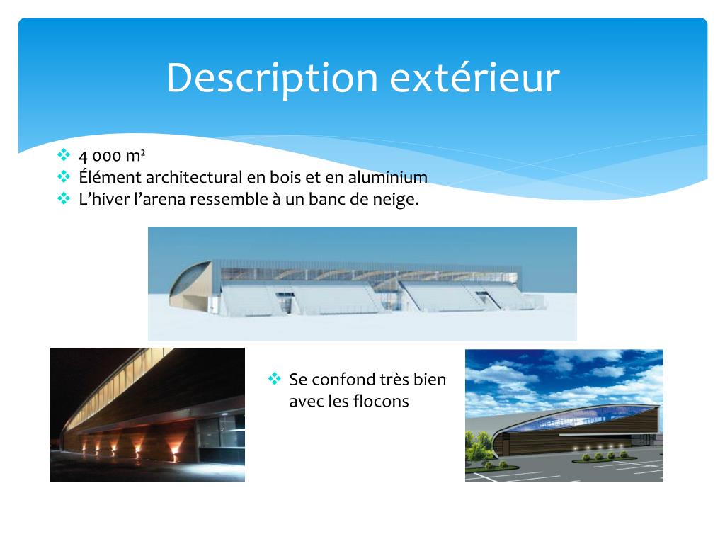 Description extérieur • 4 000 m² • Élément architectural en bois et en aluminium • L’hiverl’arenaressemble à un banc de neige. • Se confondtrèsbien avec les flocons
