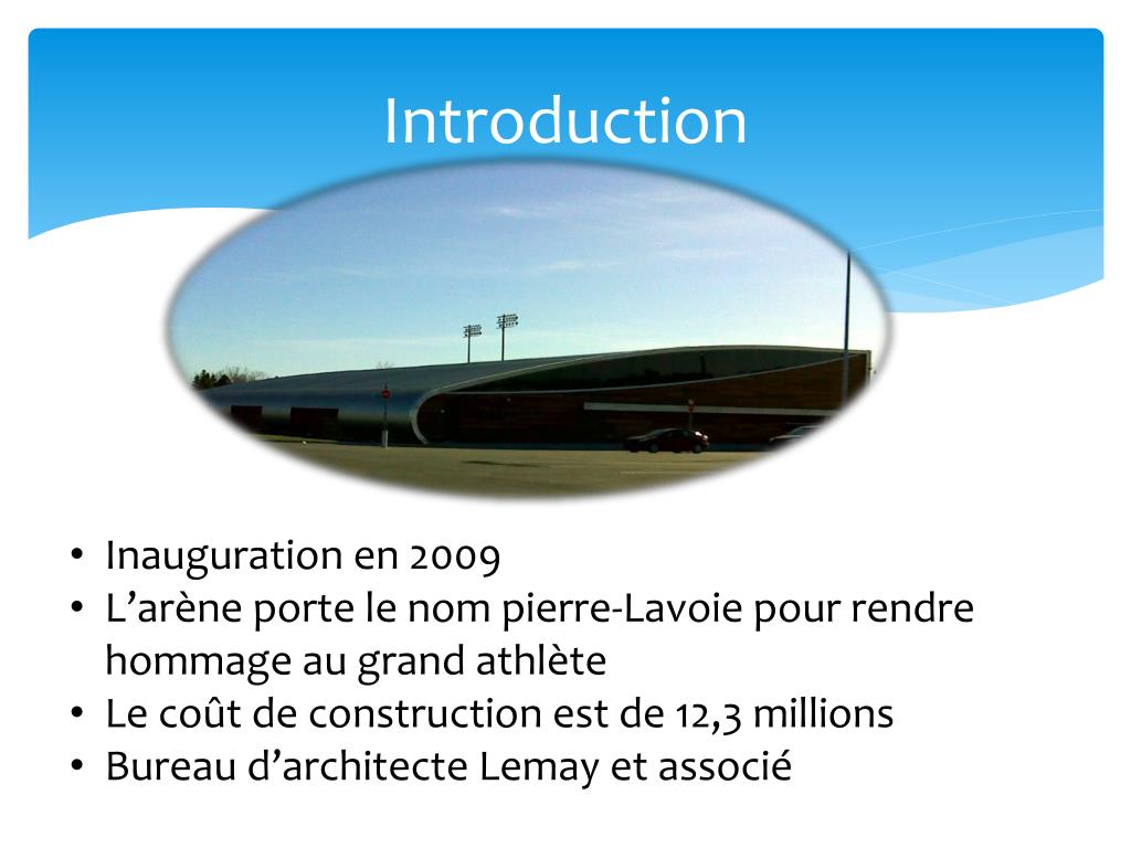 Introduction • Inauguration en 2009 • L’arèneporte le nom pierre-Lavoie pour rendrehommage au grand athlète • Le coût de construction est de 12,3 millions • Bureau d’architecte Lemay et associé