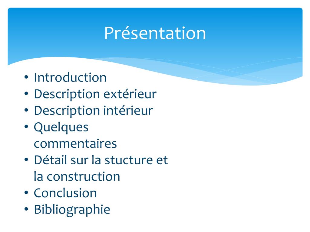 Présentation • Introduction • Description extérieur • Description intérieur • Quelquescommentaires • Détailsur la stucture et la construction • Conclusion • Bibliographie