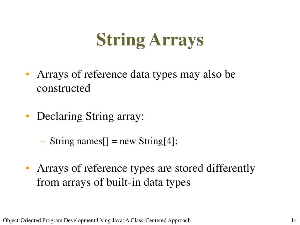 String Arrays • Arrays of reference data types may also be constructed • Declaring String array: • String names[] = new String[4]; • Arrays of reference types are stored differently from arrays of built-in data types Object-Oriented Program Development Using Java: A Class-Centered Approach