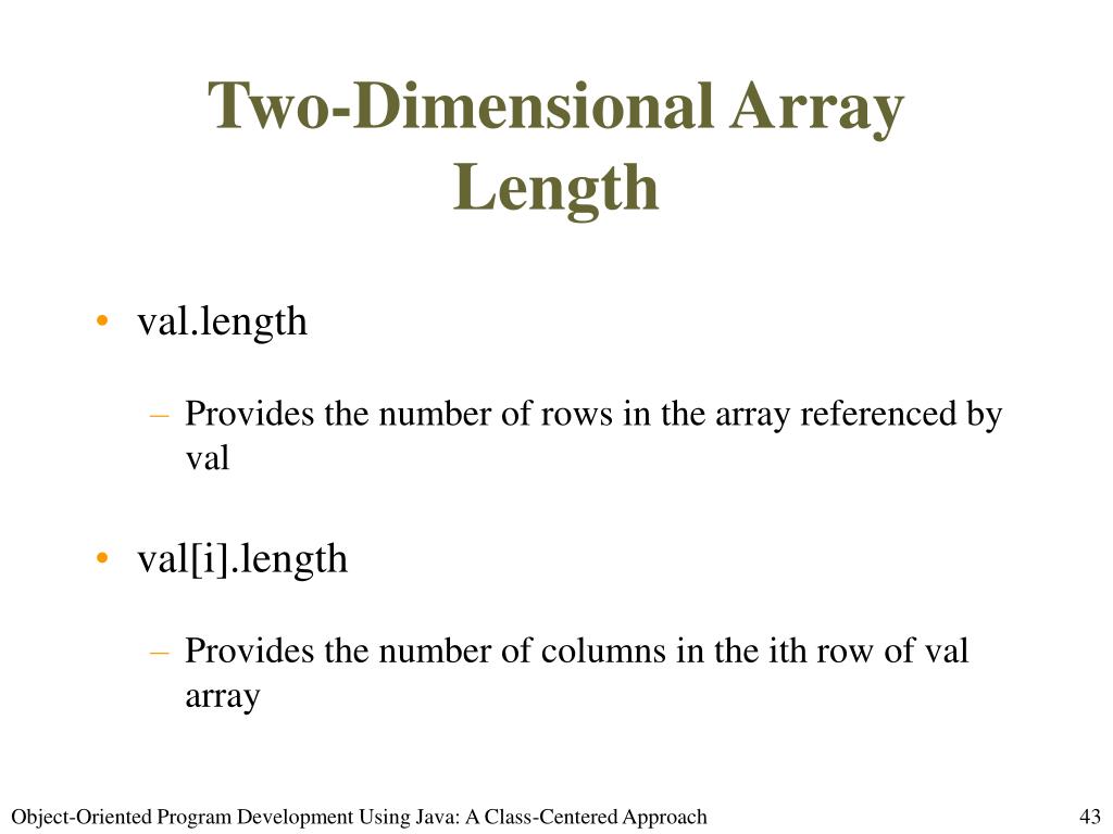 Two-Dimensional Array Length • val.length • Provides the number of rows in the array referenced by val • val[i].length • Provides the number of columns in the ith row of val array Object-Oriented Program Development Using Java: A Class-Centered Approach