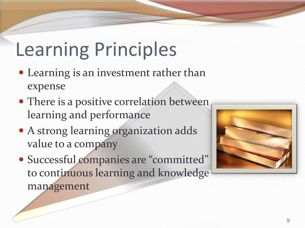 Learning Principles • Learning is an investment rather than expense • There is a positive correlation between learning and performance • A strong learning organization adds value to a company • Successful companies are “committed” to continuous learning and knowledge management