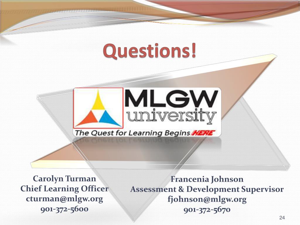Questions! Carolyn Turman Chief Learning Officer cturman@mlgw.org 901-372-5600 Francenia Johnson Assessment & Development Supervisor fjohnson@mlgw.org 901-372-5670