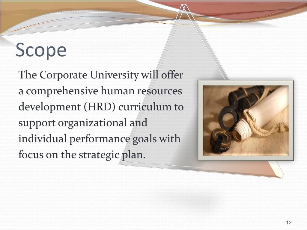 Scope The Corporate University will offer a comprehensive human resources development (HRD) curriculum to support organizational and individual performance goals with focus on the strategic plan.
