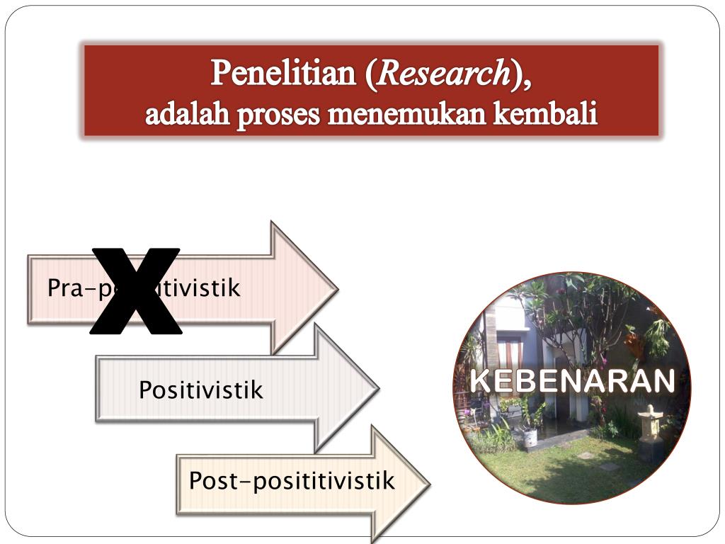 Penelitian (Research),adalahprosesmenemukankembali X Pra-posititivistik Kebenaran Positivistik Post-posititivistik